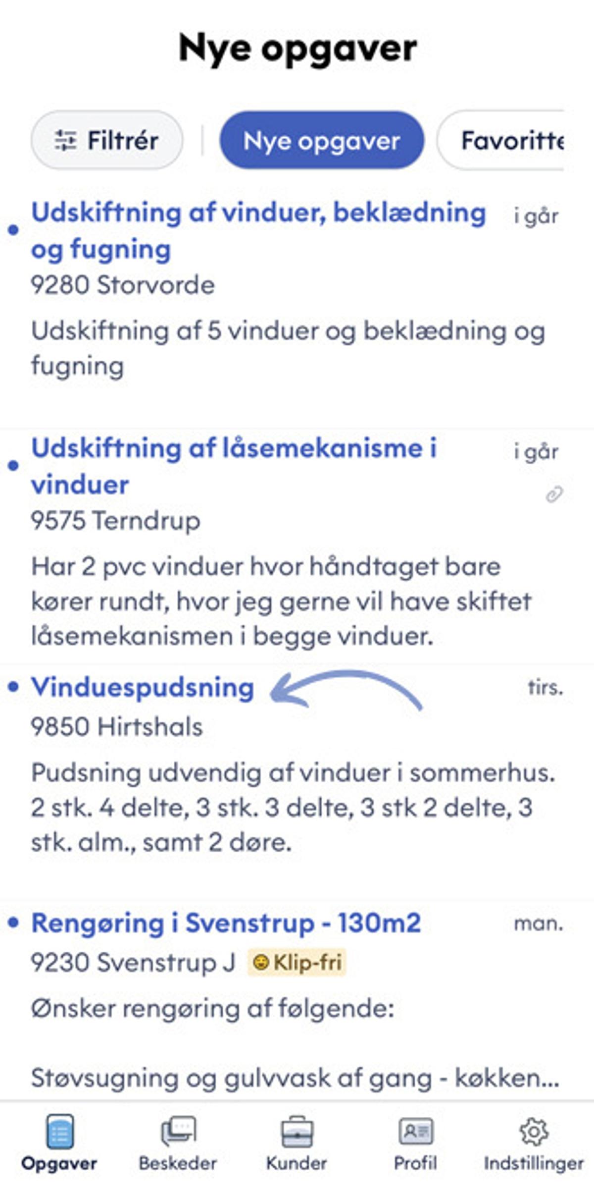 Når du er logget ind på 3byggetilbud Match, kommer du ind forsiden som viser de nyeste opgaver først. Her vil forskellige kategorier komme frem - tryk blot på ’klip-fri’ for at komme videre.