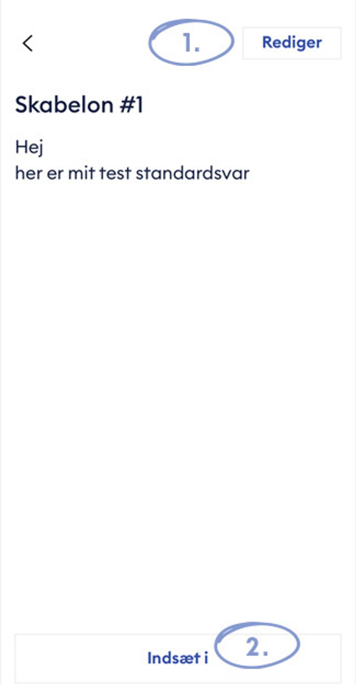 Når du åbner skabelonbeskeden, vises et tekstudkast . For at ændre i standardteksten, trykker du på ’Rediger’, og når teksten er færdig, trykker du på ’Gem’ og derefter ’Indsæt i’.